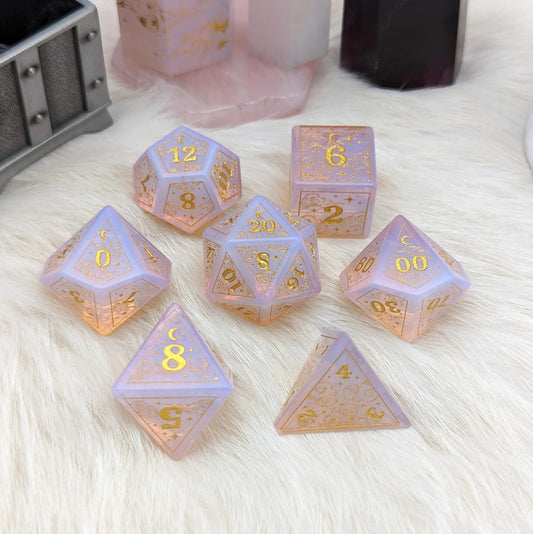 Dreamy Glowing Pink Opalite - 7 Dice Set (Gold)