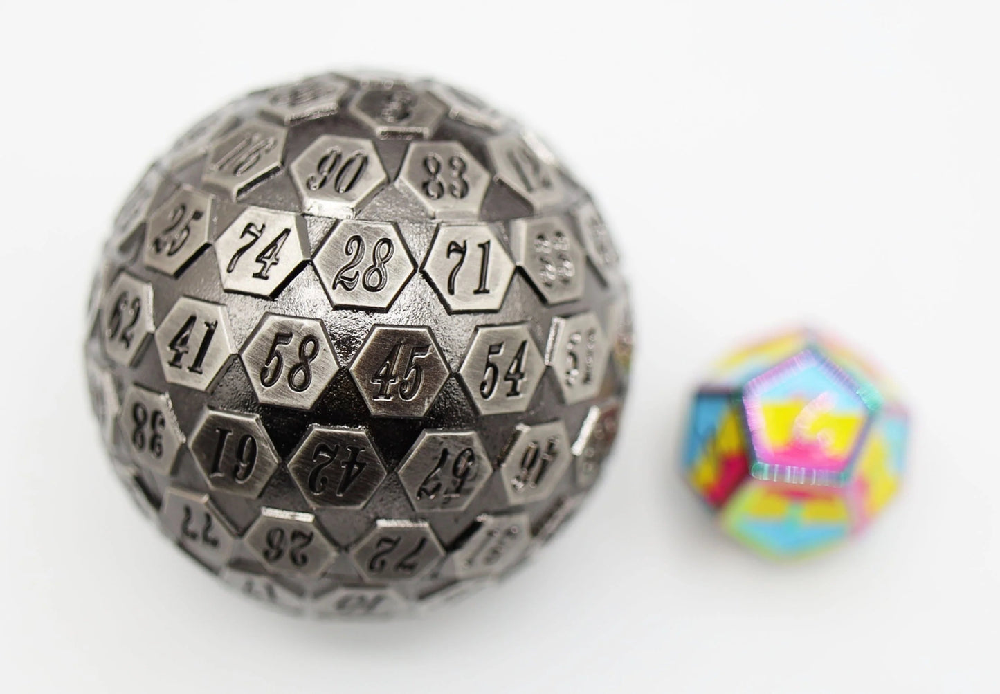 This D100 is AMAZING! It weights nearly 11 ounces and is the heaviest die we've ever carried. The numbers are raised making it very easy to stop rolling and to see which number is facing straight upward.