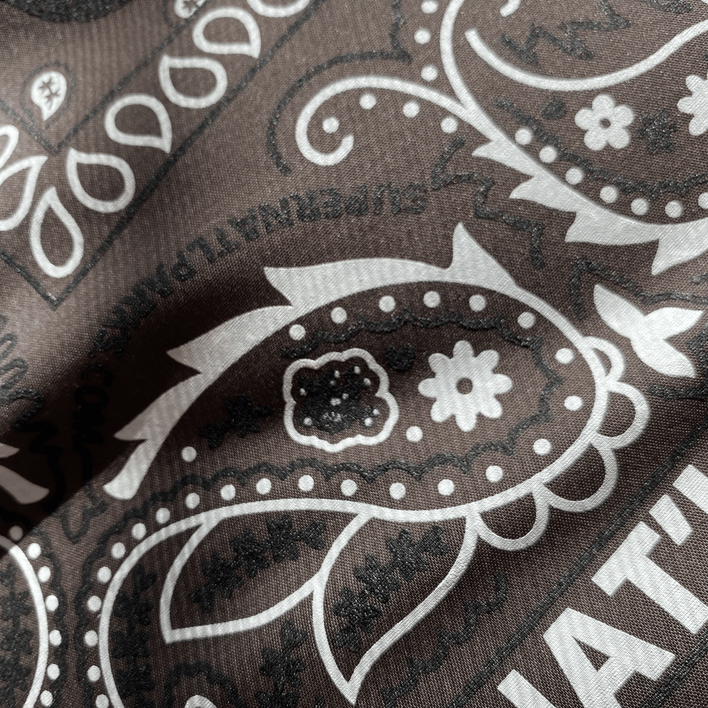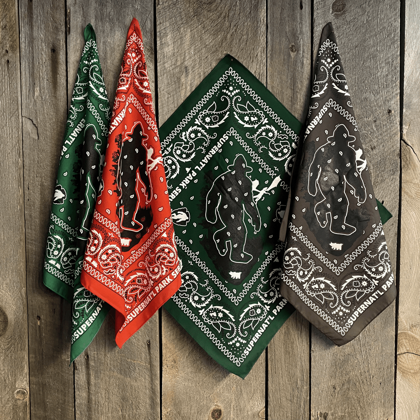 The first ever bandana from the Supernat'l Park Service is here just in time for hiking season! The ultimate outdoor accessory, in a design that evokes classic bandanas, but adds our own Ranger Bigfoot and more cryptids and monsters! (Some are hiding in the details. Can you spot them all?)