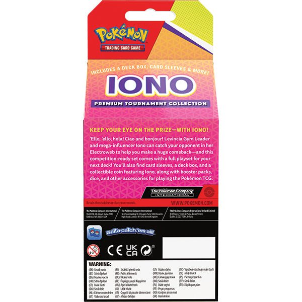 ’Ello, ’ello, hola! Ciao and bonjour! Levincia Gym Leader and mega-influencer Iono can catch your opponent in her Electroweb to help you make a huge comeback—and this competition-ready set comes with a full playset for your next deck! You’ll also find card sleeves, a deck box, and a collectible coin featuring Iono, along with booster packs, dice, and other accessories for playing the Pokémon TCG.