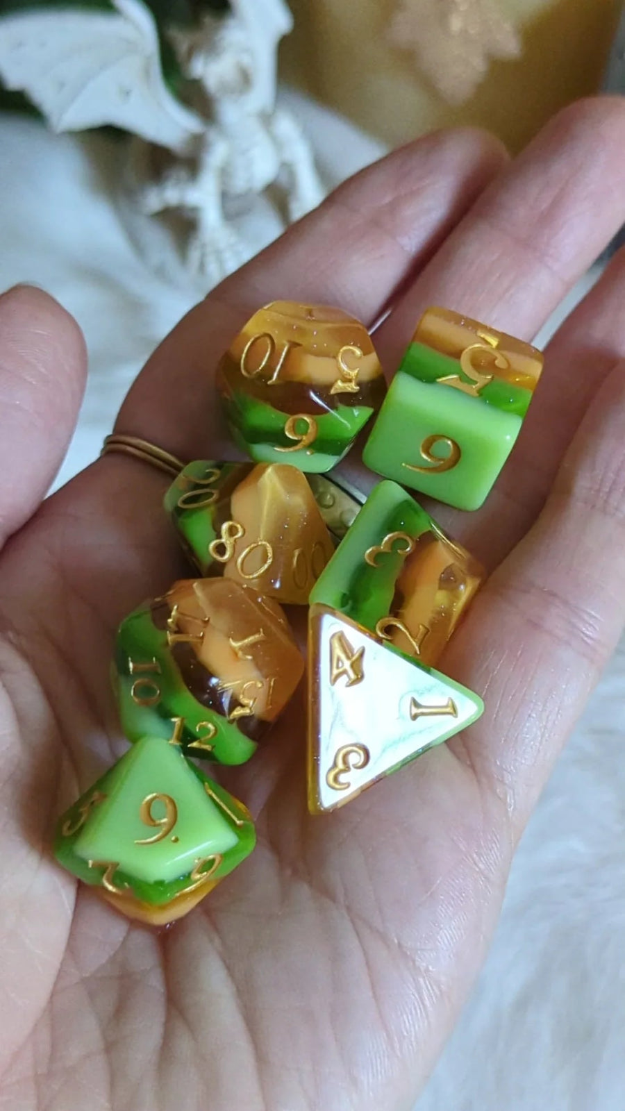 Step into the heart of the forest with Timberlight, a breathtaking 7-piece dice set with an enchanting gradient from nature’s brightest hues. This set features layered ombre tones of bright light green, medium green, earthy brown, auburn, and light creamy yellow, all perfectly accented with a shimmering metallic gold fantasy font.