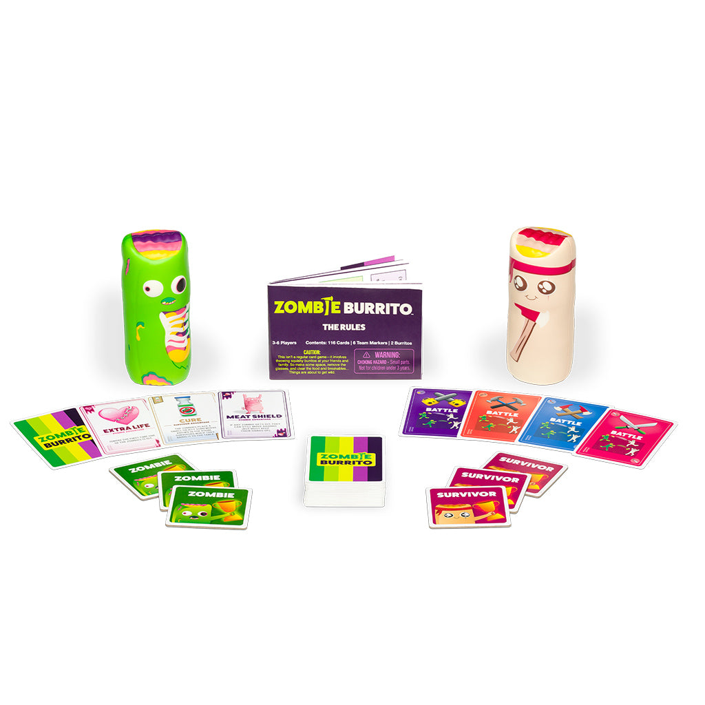 Each game involves two teams, Zombies and Survivors. Pick your side, then work to collect sets of 3 matching cards. Some cards give Survivors special abilities, some help out the Zombies, and some incite an epic battle between the living and the undead. During a battle, it’s up to you and your teammate to knock out your opponents with a squishy Burrito. The first team to win 3 Battles wins the game!